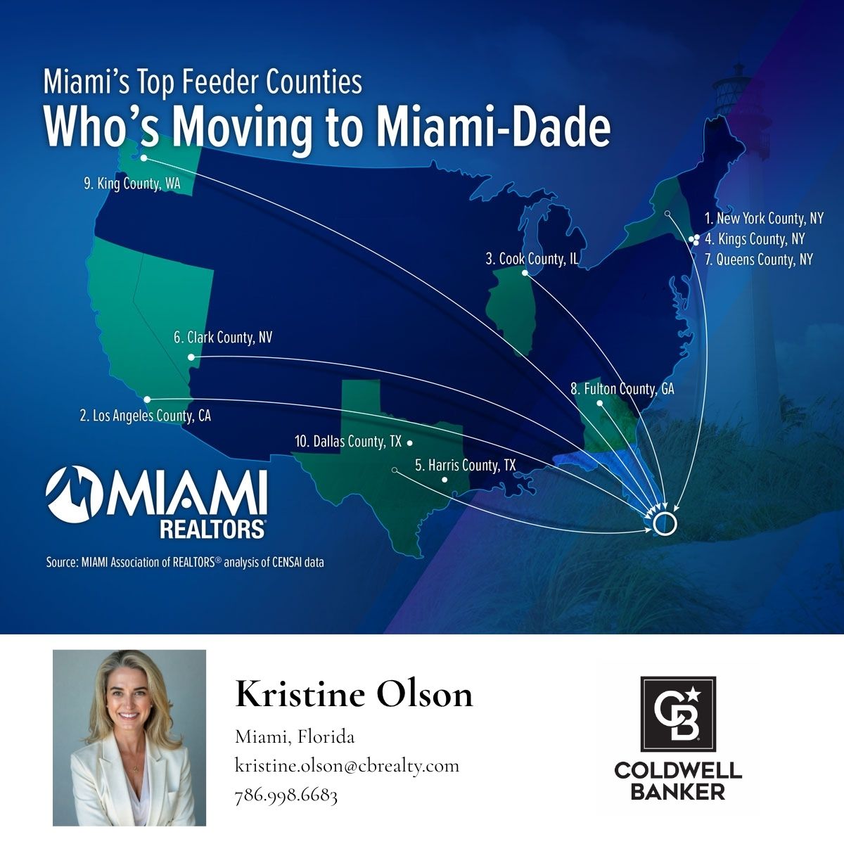 Miami continues to shine as one of the most desirable luxury destinations in the world — and the numbers prove it. According to the MIAMI Association of REALTORS®, the top feeder counties sending new residents to Miami-Dade span coast-to-coast, from New York to Los Angeles.