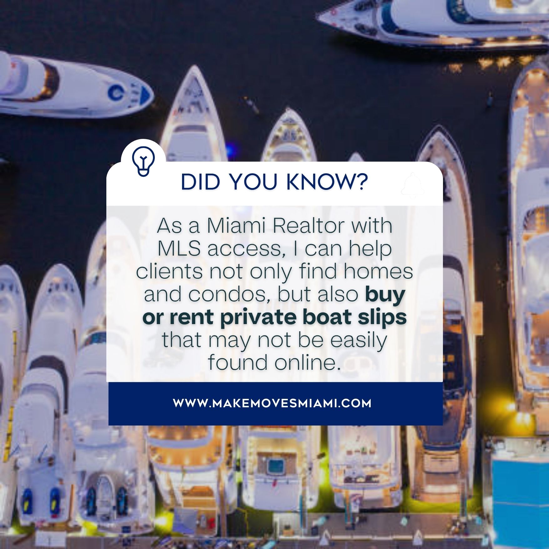 As a Miami Realtor with MLS access, I can help clients not only find homes and condos, but also buy or rent private boat slips that may not be easily found online. Many of these listings are tucked within gated communities, private marinas, or boutique developments with exclusive water access.